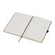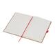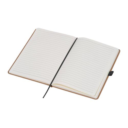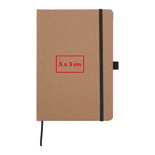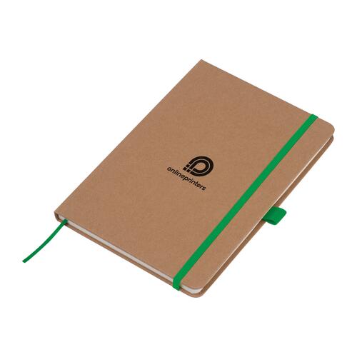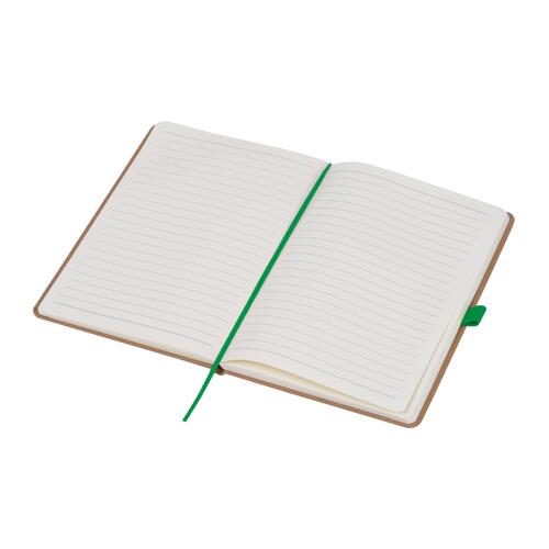 - Carnet A5 en papier recyclé avec 160 pages lignées, un marque-page ainsi qu'un passant pour stylo à bille dont la couleur est assortie à celle du ruban de fermeture