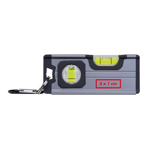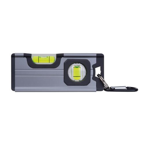- Mini niveau à bulle en aluminium avec des applications en plastique ABS, deux fioles, un aimant sur le dessous et un mousqueton