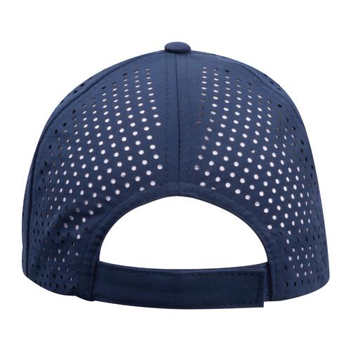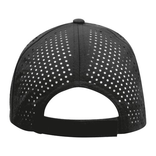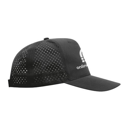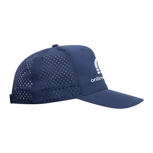 - Casquette baseball à 5 panneaux en polyester avec fermeture velcro à l'arrière de la tête et bande de transpiration à l'intérieur